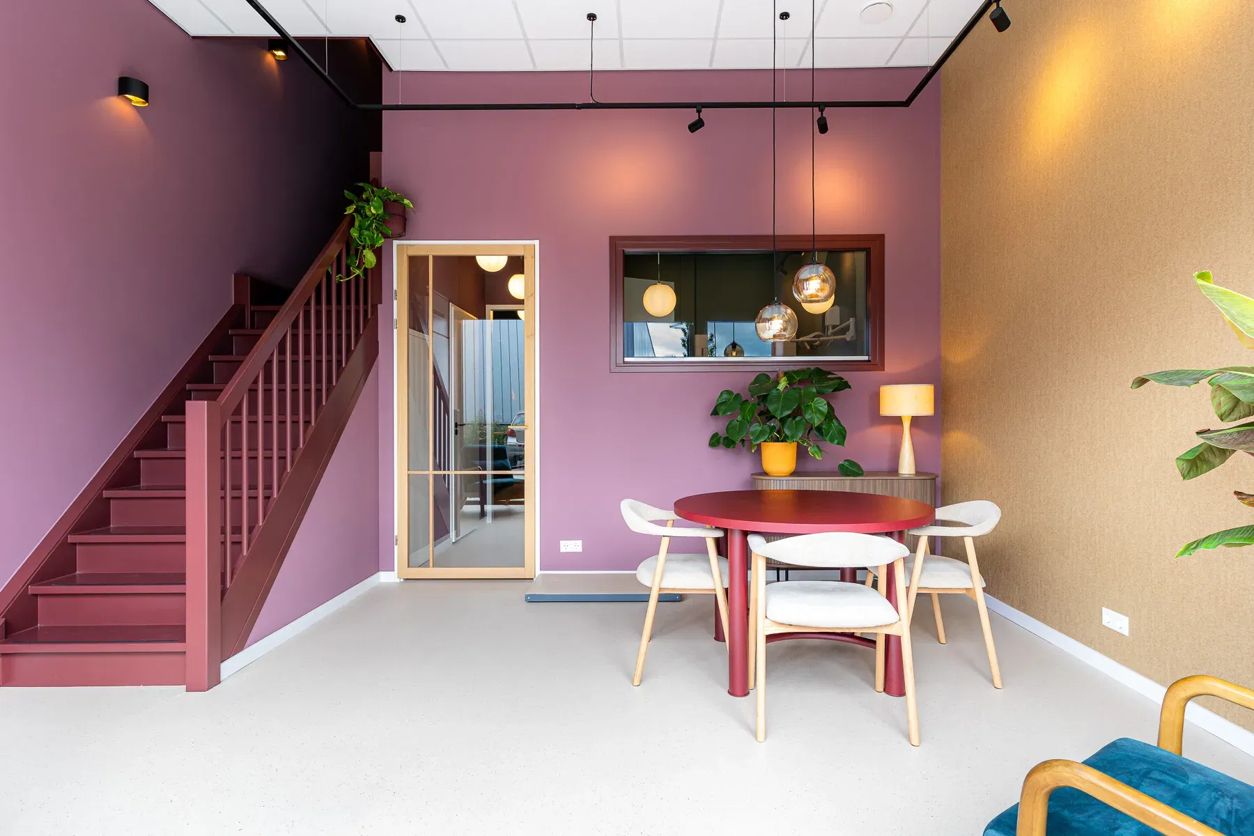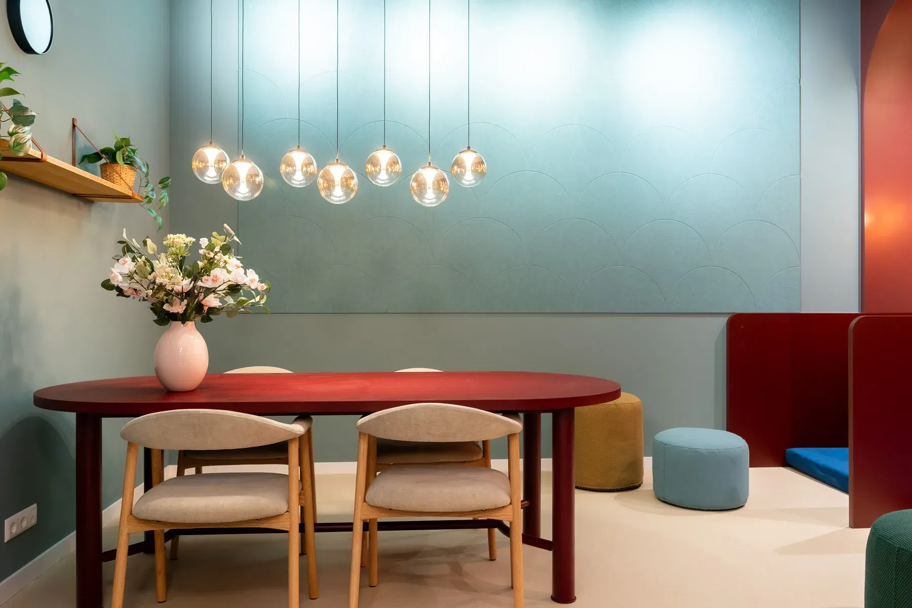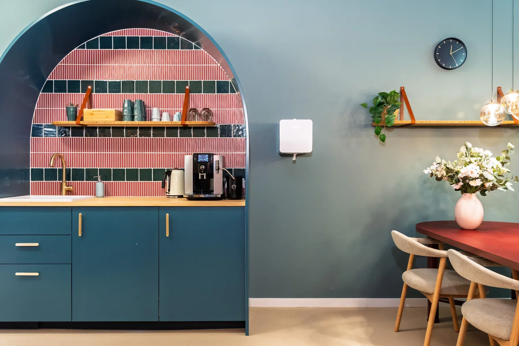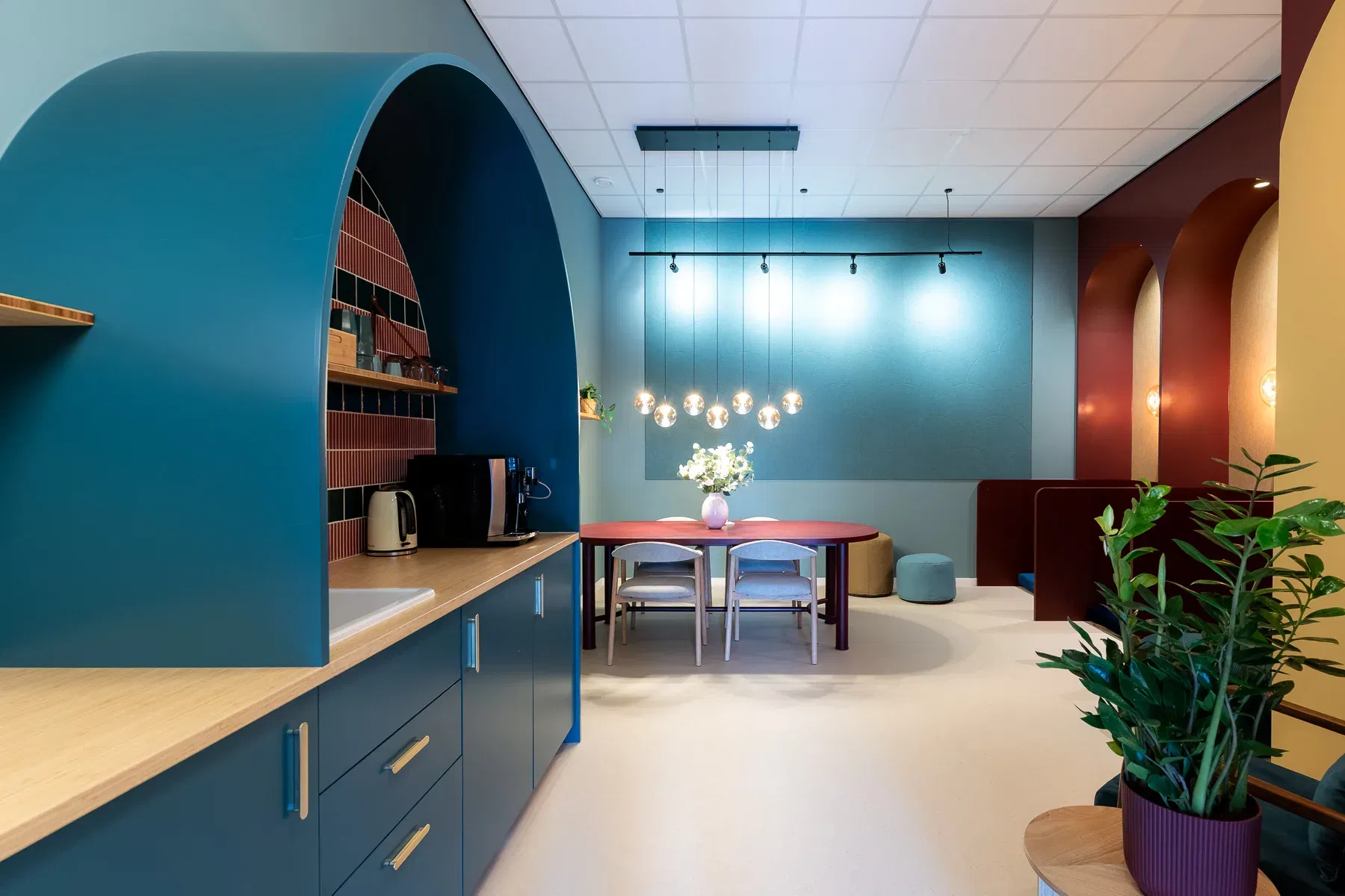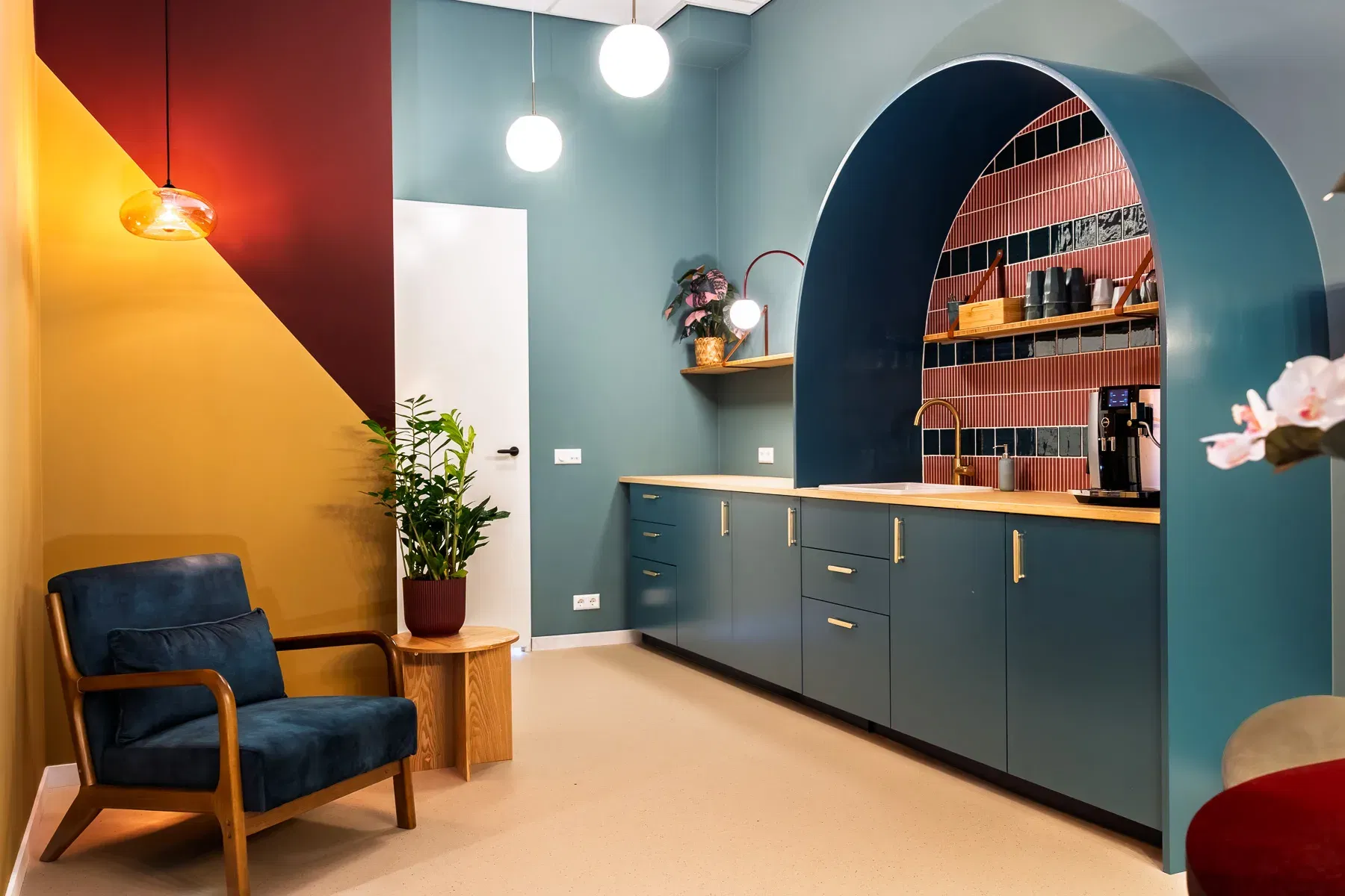Het interieur van MariVet ademt rust, vertrouwen en zachtheid. Ronde vormen spelen de hoofdrol – zichtbaar in het maatwerk met zachte bogen in het keukenblok, de nisjes waar honden ontwaken na narcose, én in de tafels en verlichting. Deze vloeiende lijnen verzachten de ruimte en zorgen voor een vriendelijke, natuurlijke uitstraling.