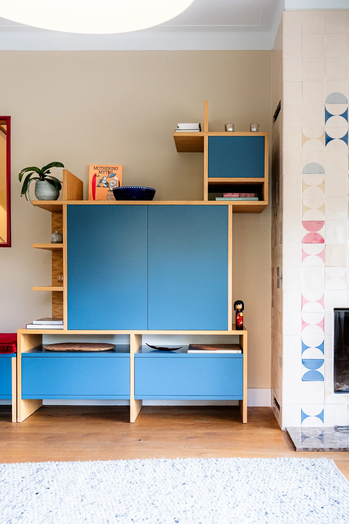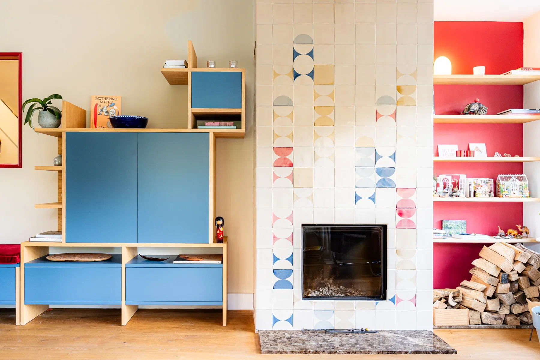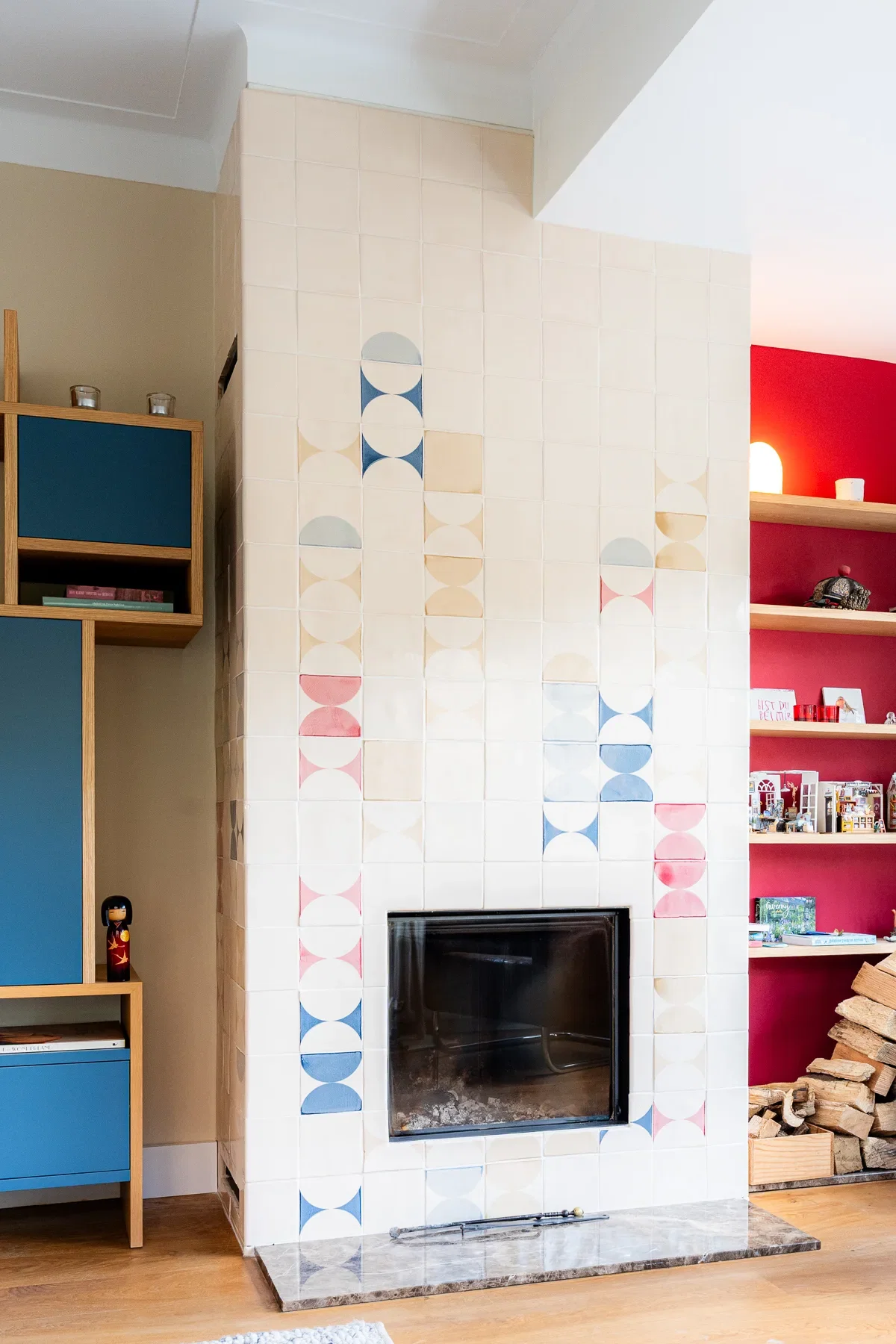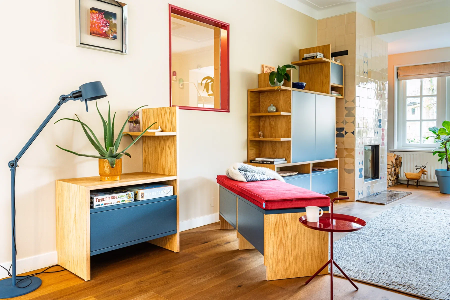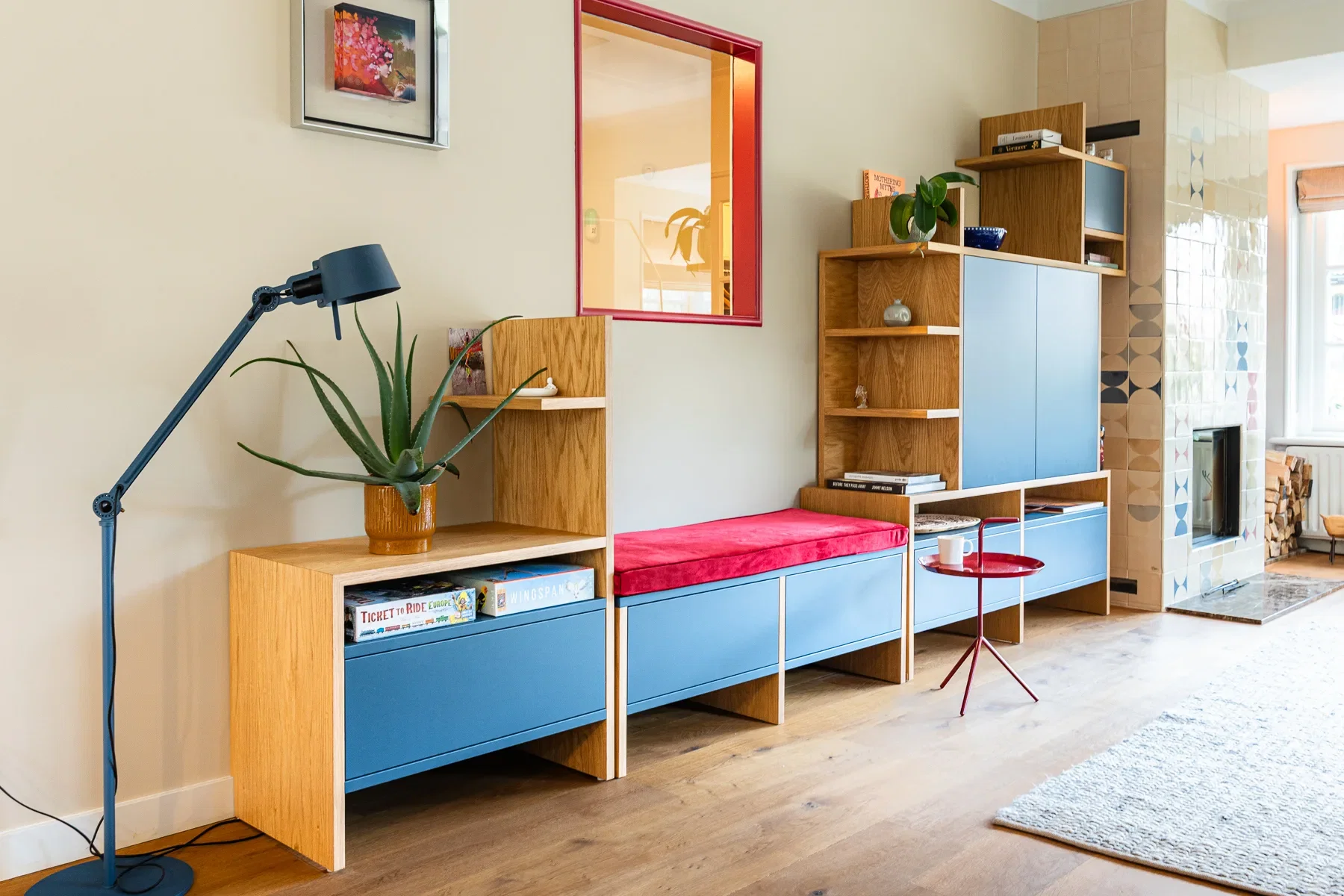 Ik heb de bestaande kast als basis genomen en er een nieuw ontwerp omheen gebouwd. De witte deurtjes maakten plaats voor blauw, en de kast werd uitgebreid met een speels bankje dat je er bij bezoek gewoon uittrekt voor extra zitruimte. De haard kreeg handgemaakte tegels van Smink Studio, met afgeronde hoeken op maat. Juist die details trekken de aandacht en maken van de haard de eyecatcher van de ruimte. Naast de haard kwamen planken, zodat ook dat hoekje meer functie en samenhang kreeg. Het raampje naar de hal? Dat mocht ook wat meer aandacht, dus dat kreeg een rood kozijn.