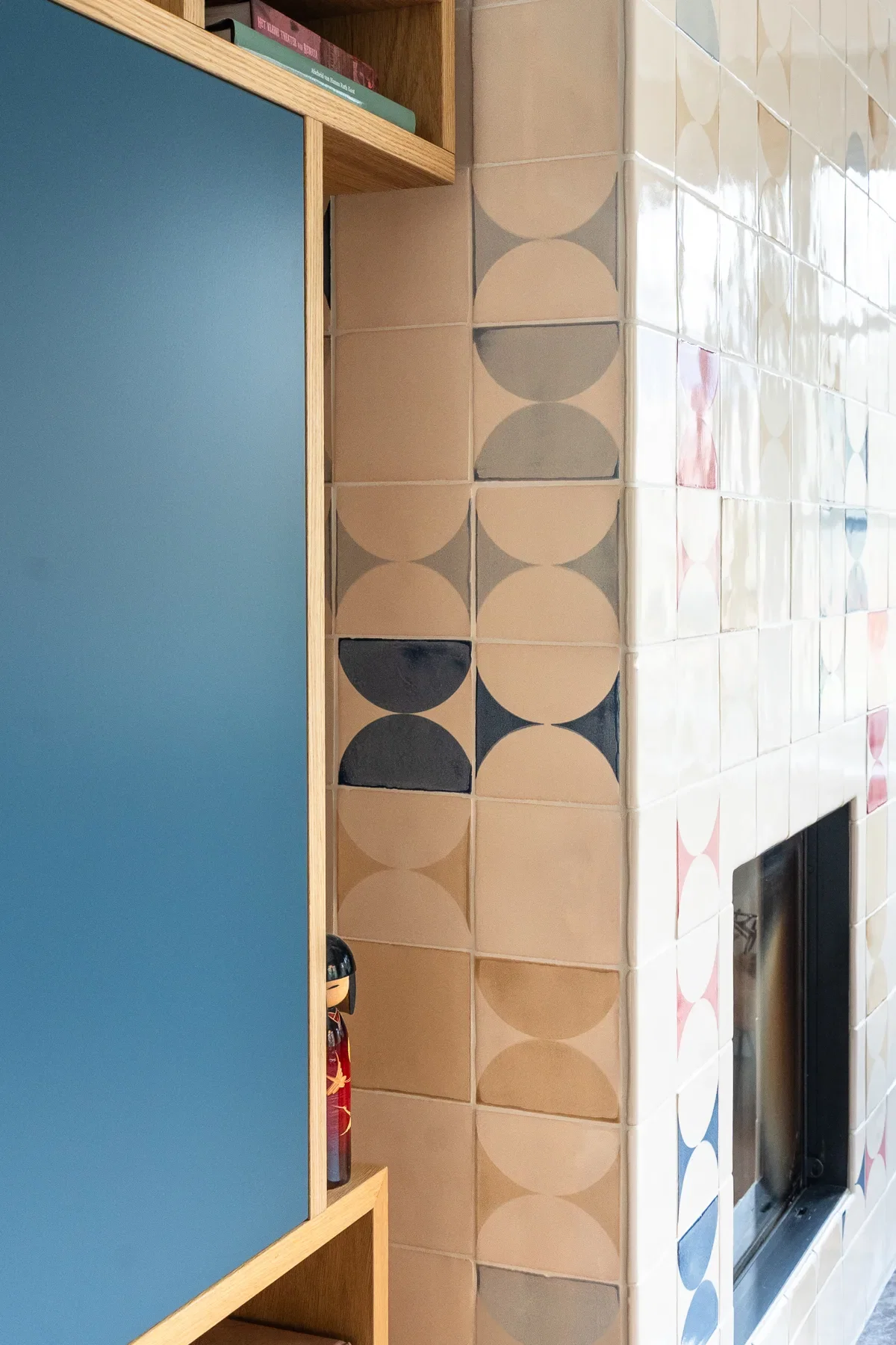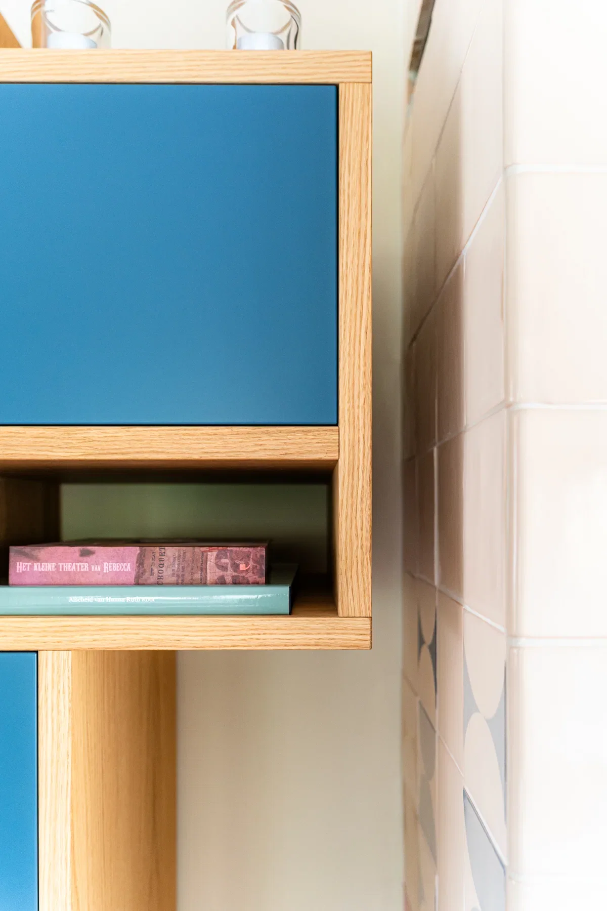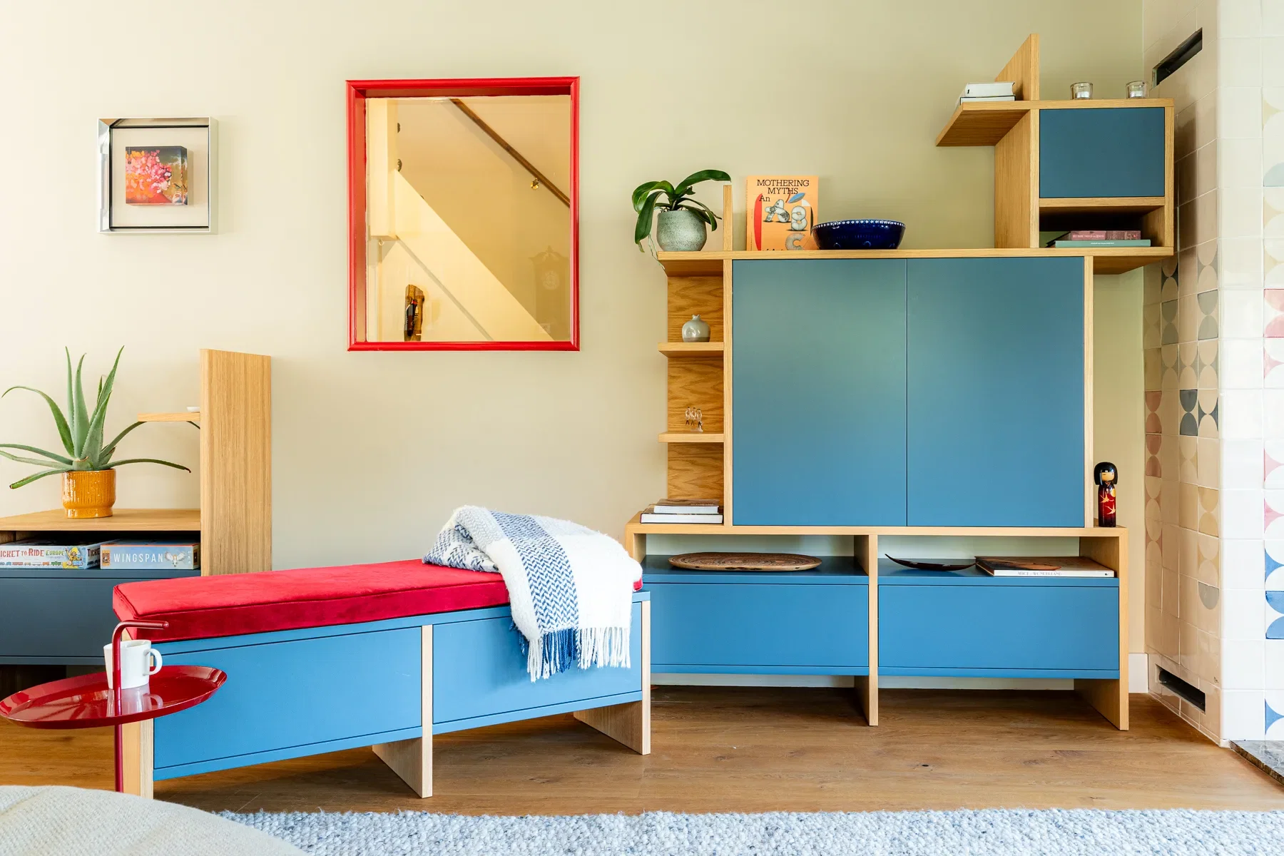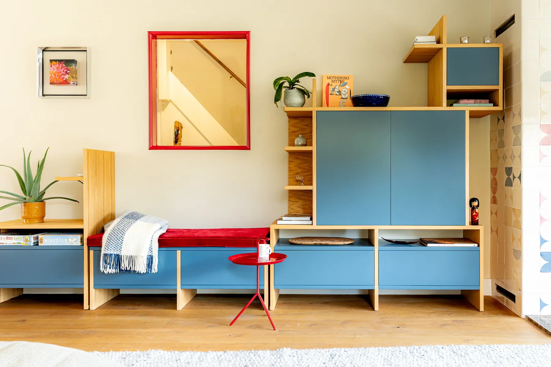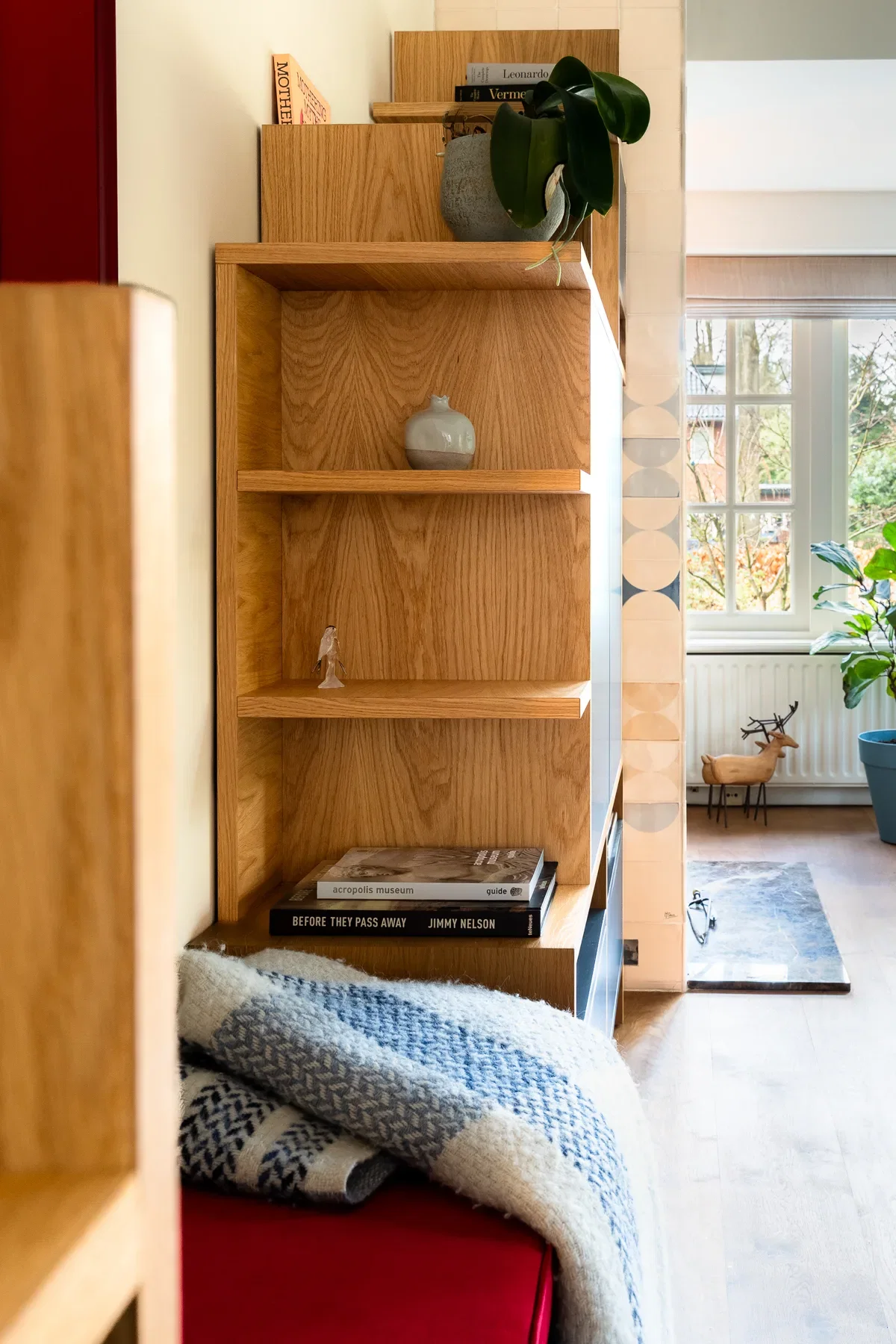 Ik heb de bestaande kast als basis genomen en er een nieuw ontwerp omheen gebouwd. De witte deurtjes maakten plaats voor blauw, en de kast werd uitgebreid met een speels bankje dat je er bij bezoek gewoon uittrekt voor extra zitruimte. De haard kreeg handgemaakte tegels van Smink Studio, met afgeronde hoeken op maat. Juist die details trekken de aandacht en maken van de haard de eyecatcher van de ruimte. Naast de haard kwamen planken, zodat ook dat hoekje meer functie en samenhang kreeg. Het raampje naar de hal? Dat mocht ook wat meer aandacht, dus dat kreeg een rood kozijn.
