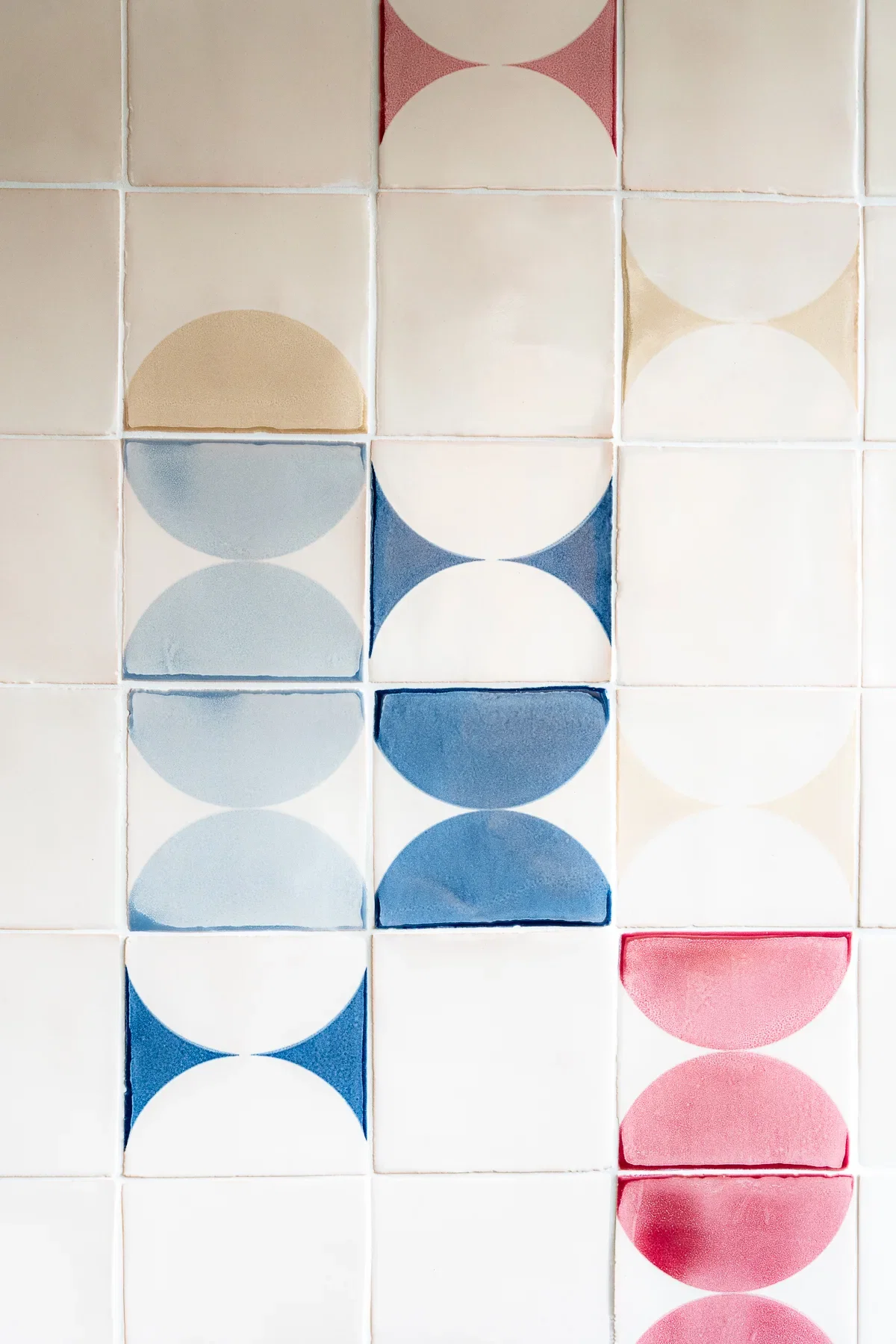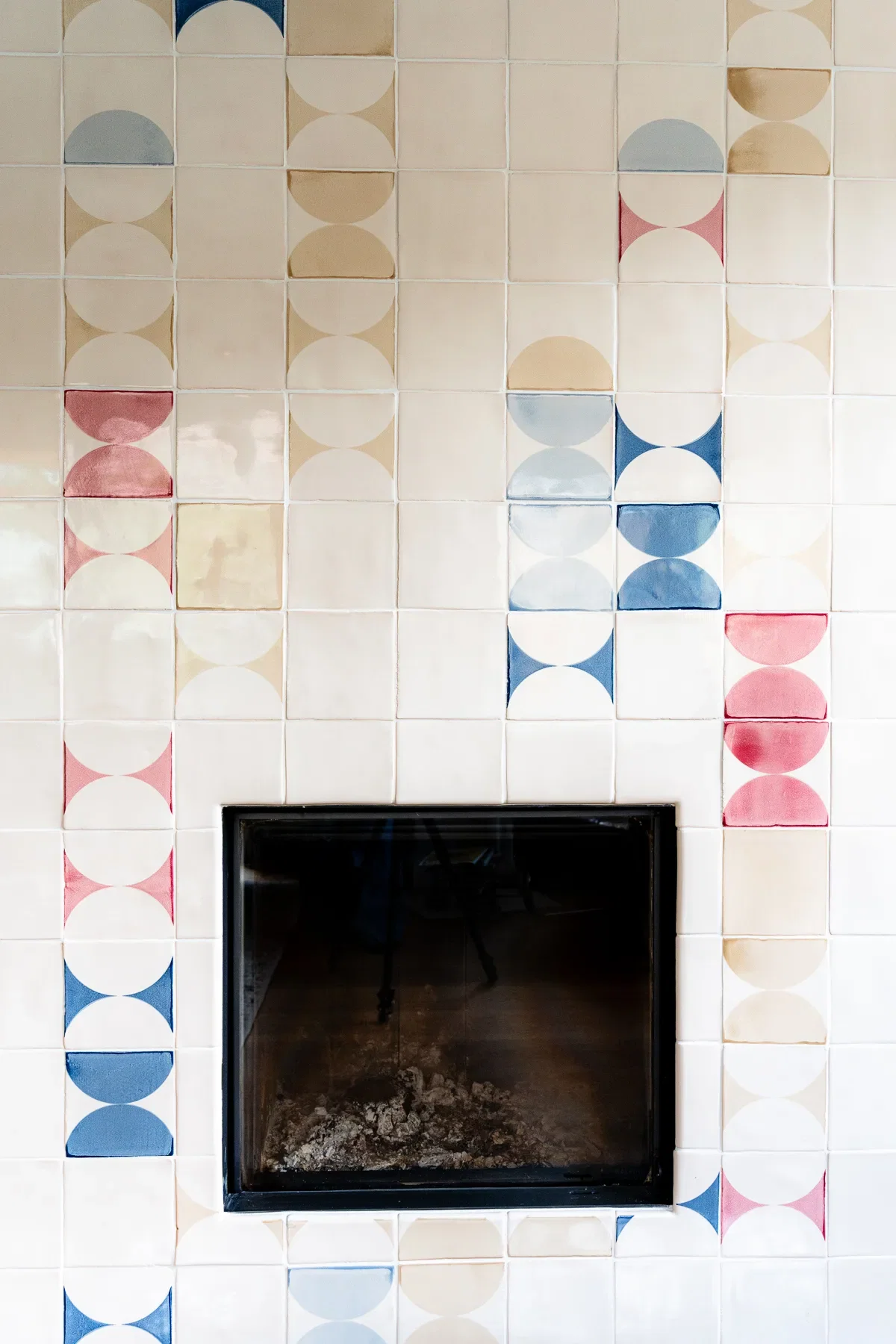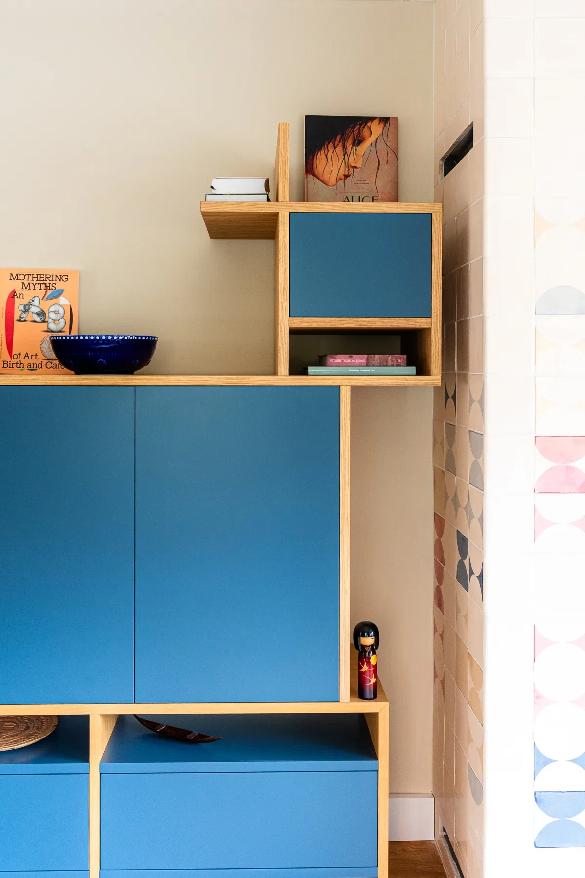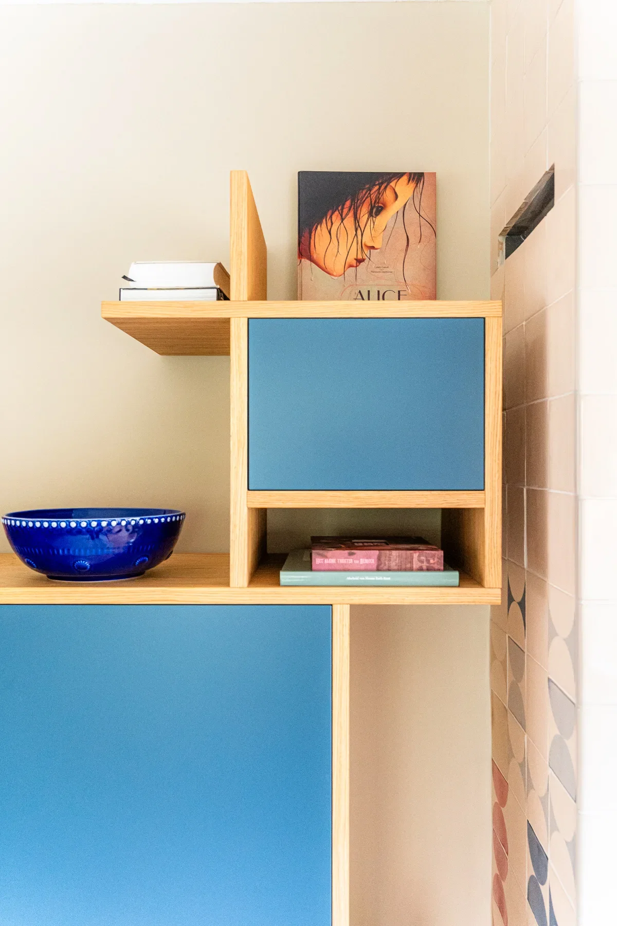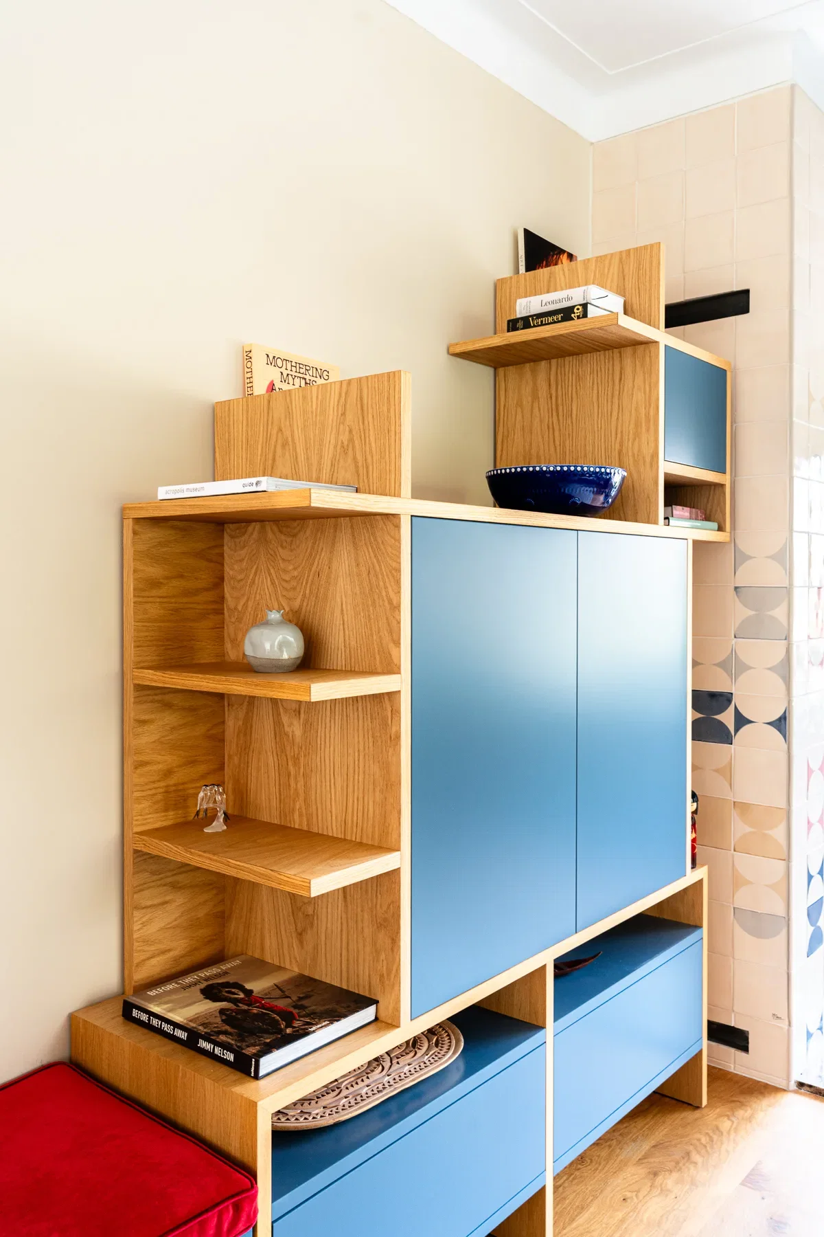Ik heb de bestaande kast als basis genomen en er een nieuw ontwerp omheen gebouwd. De witte deurtjes maakten plaats voor blauw, en de kast werd uitgebreid met een speels bankje dat je er bij bezoek gewoon uittrekt voor extra zitruimte. De haard kreeg handgemaakte tegels van Smink Studio, met afgeronde hoeken op maat. Juist die details trekken de aandacht en maken van de haard de eyecatcher van de ruimte. Naast de haard kwamen planken, zodat ook dat hoekje meer functie en samenhang kreeg. Het raampje naar de hal? Dat mocht ook wat meer aandacht, dus dat kreeg een rood kozijn.